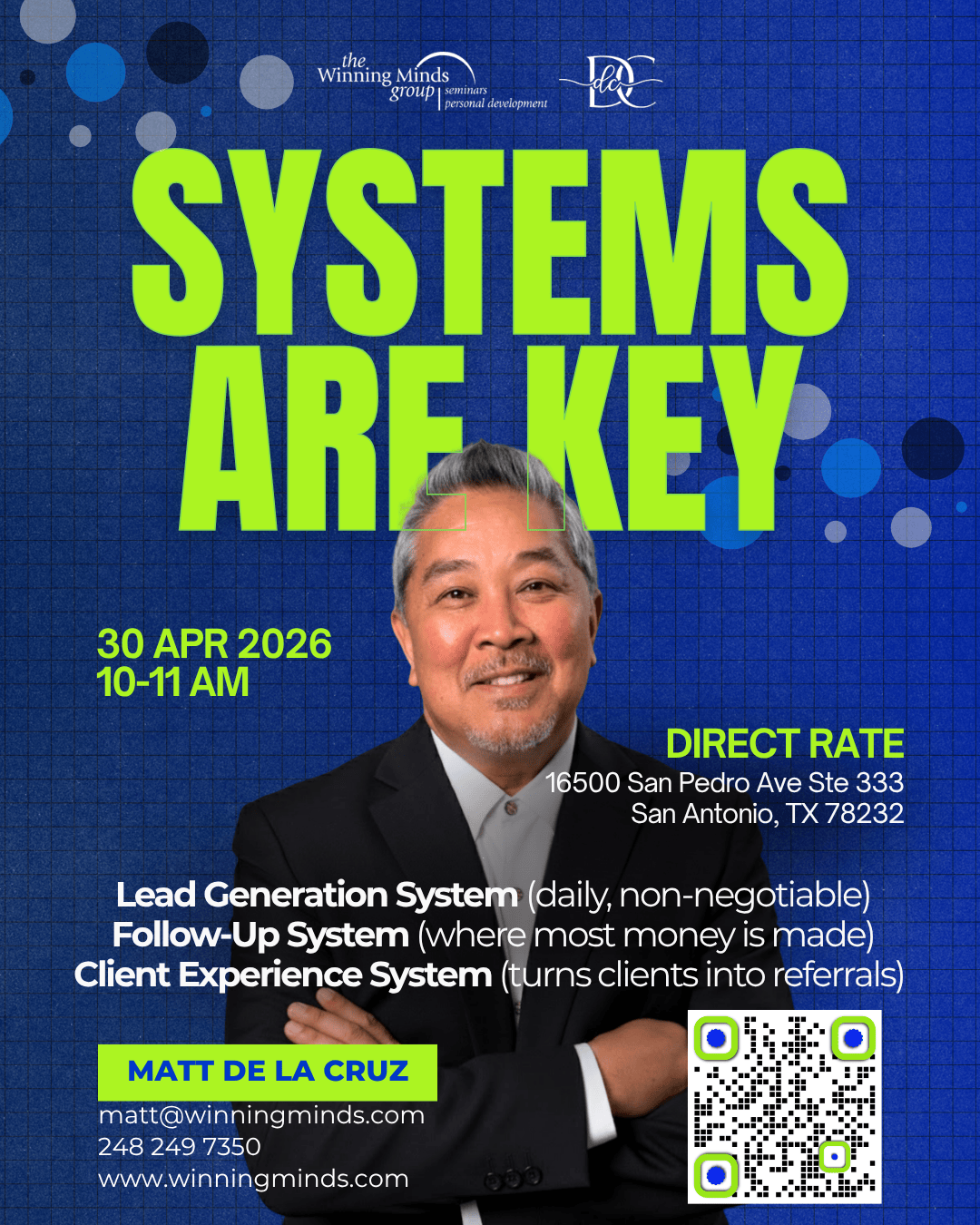 Matt De La Cruz is the founder of The Winning Minds Group and De La Cruz Coaching. Over the past two decades, he has worked as a consultant to many Fortune 500 companies from all around the globe. Since starting The Winning Minds Group, Matt has risen to the top of the personal development industry.